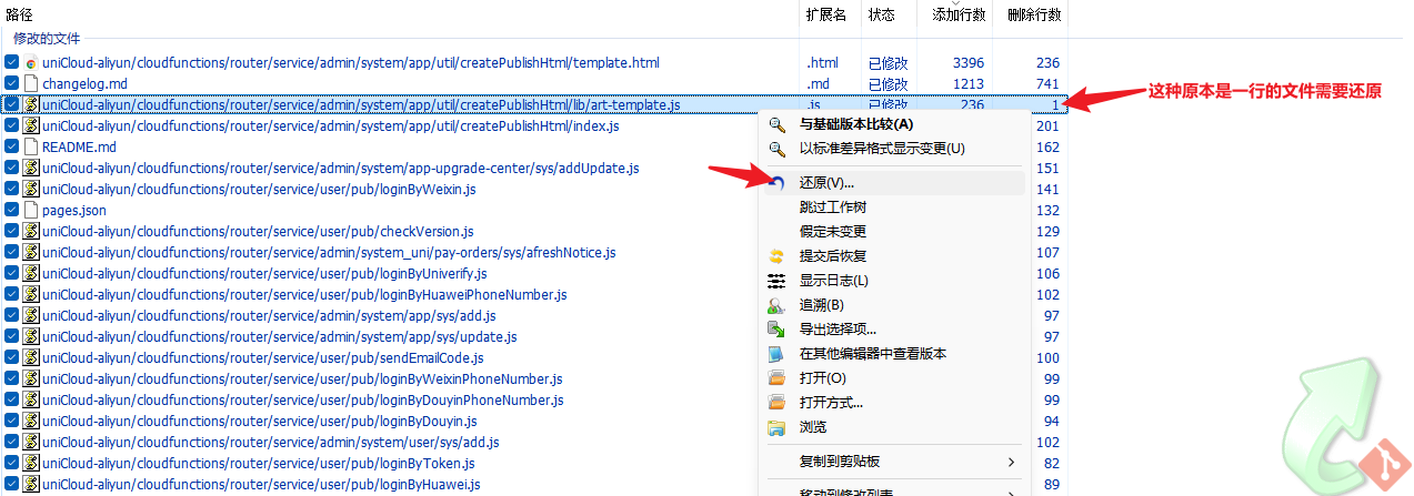 如 router/service/admin/system/app/util/createPublishHtml/lib/art-template.js 这些文件原本被压缩成一行或几行的文件,最好不要格式化,所以需要还原 Ta,如下图所示